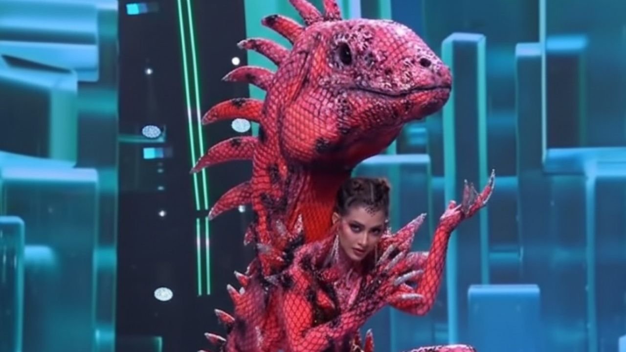 El traje, diseñado por el tailandés Akarach Phusanaphong bajo la dirección de CNB Ecuador y con la idea creativa de Mariella Bustamante, rinde homenaje a la Conolophus marthae, una especie endémica y en peligro crítico de extinción que habita exclusivamente en el Volcán Wolf de la Isla Isabela. La pieza se ajusta al cuerpo de Quenedit y reproduce con fidelidad los rasgos del reptil: un vibrante tono rosado con franjas negras, una cabeza de iguana de gran tamaño y una larga cola que añade dramatismo a su paso por la pasarela.