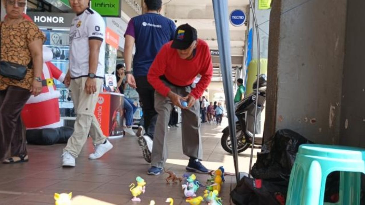 A menos de una semana del Black Friday, la Bahía de Guayaquil mantiene su propio ritmo, lejos de los letreros llamativos y las bocinas de rebajas. En las calles Colón y Malecón, Ramón Recalde, vendedor ambulante de 70 años, ofrece juguetes de cuerda a un dólar, en una escena que se repite cada día como un ritual.