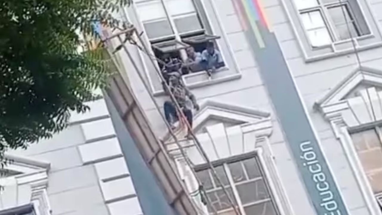 El incidente ocurrió cerca de las 16:00, en la intersección de las calles Pichincha y Aguirre. Testigos relataron que la estructura presentó un desperfecto, se viró y terminó desprendiéndose de manera repentina. Uno de los trabajadores cayó al suelo y sufrió lesiones en el brazo, mientras que su compañero quedó colgando de la cuerda de seguridad, aferrado a la plataforma inestable, en medio de la tensión de transeúntes que presenciaban la escena.