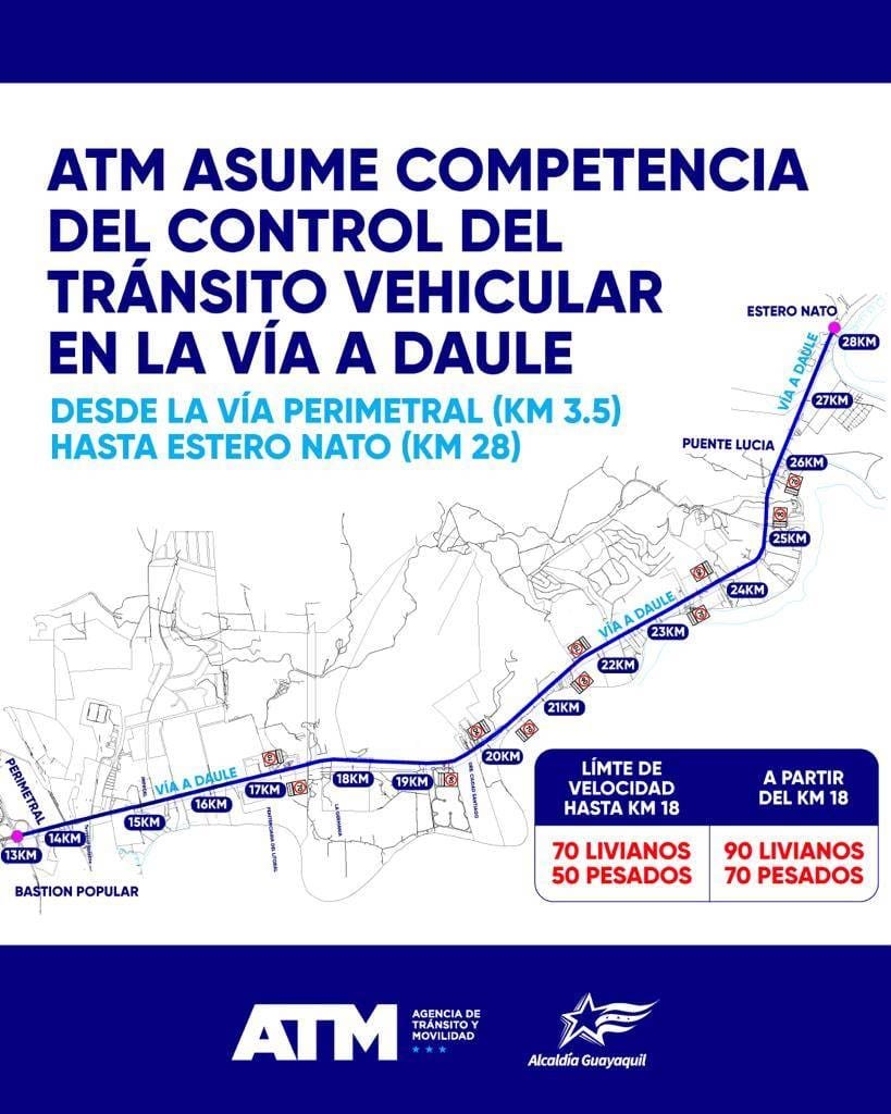 Por mandato legal, la Agencia de Tránsito y Movilidad (ATM), desde este 01 de mayo, asume el control del tránsito vehicular y peatonal en un tramo de 14.5 kilómetros de la vía a Daule, que se encuentran dentro del perímetro urbano de Guayaquil.