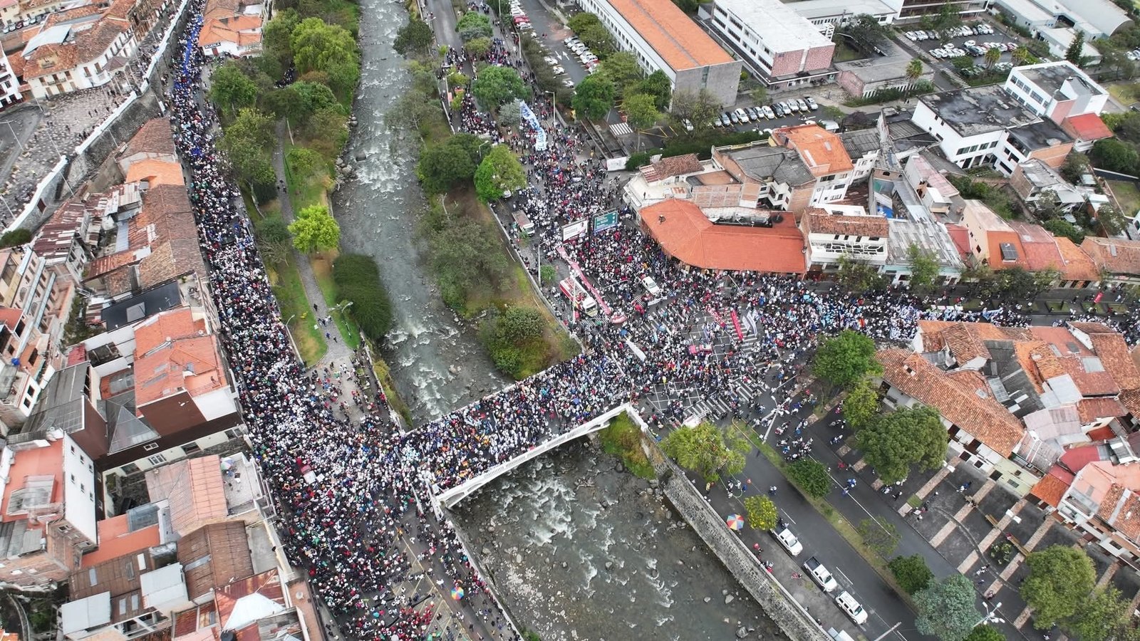 La marcha por el agua en Cuenca se desarrolla con normalidad este martes, pese al estado de excepción vigente en la provincia de Azuay y otras seis regiones, decretado por el presidente Daniel Noboa para garantizar el orden público. Más de cien mil cuencanos, incluyendo extranjeros, organizaciones indígenas y estudiantes, se tomaron las calles en rechazo a la minería en el páramo de Quimsacocha y a favor de la protección de los recursos hídricos, llenando avenidas como Doce de Abril, el puente de El Vado y la calle Condamine.
