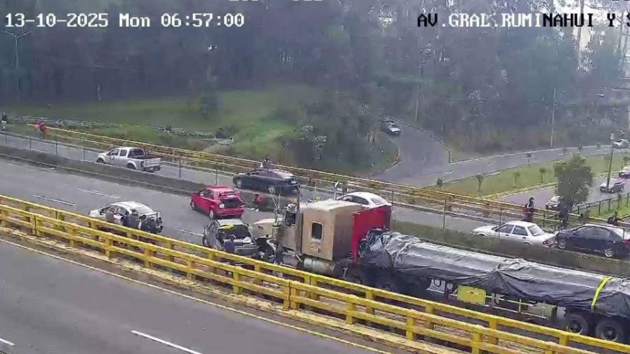 La mañana de este lunes 13 de octubre de 2025, un siniestro de tránsito alteró la rutina en el centro oriente de Quito. Un tráiler y tres vehículos livianos colisionaron en la intersección de la avenida Simón Bolívar con la autopista General Rumiñahui, generando un fuerte impacto en la circulación vehicular.