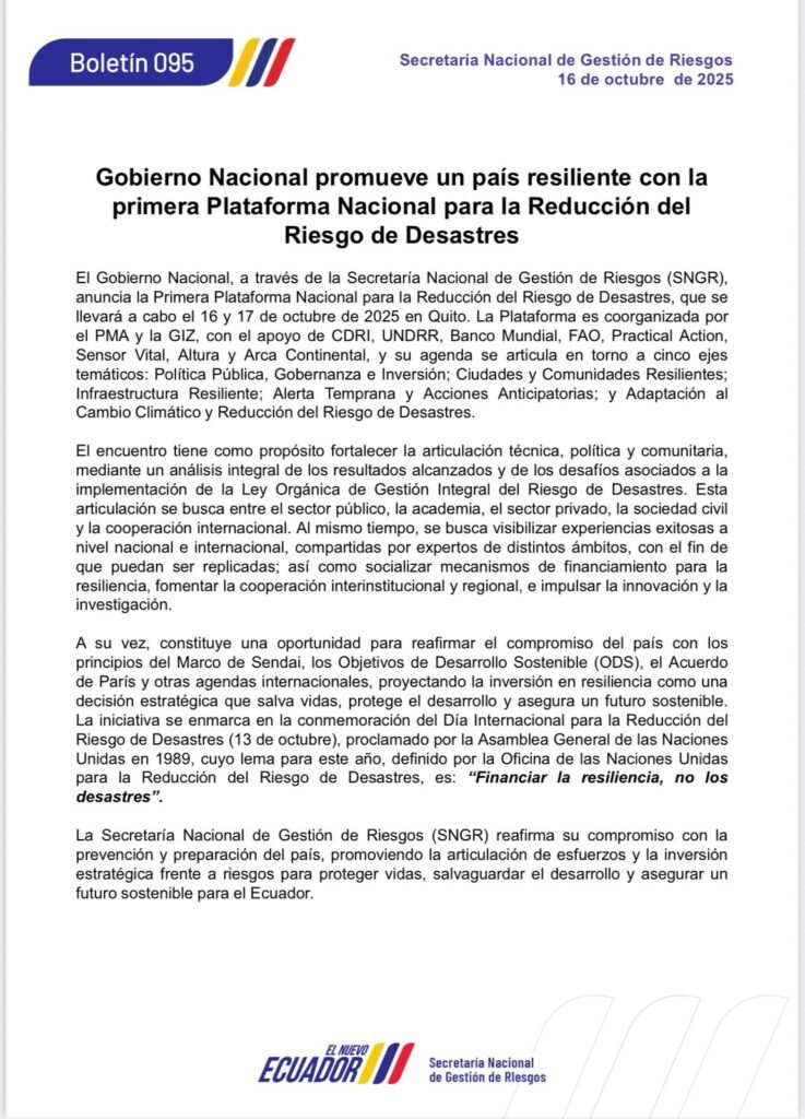 El Gobierno Nacional, a través de la Secretaría Nacional de Gestión de Riesgos (SNGR), inauguró este jueves la Primera Plataforma Nacional para la Reducción del Riesgo de Desastres, un evento que se extenderá hasta el viernes 17 de octubre en la capital ecuatoriana.