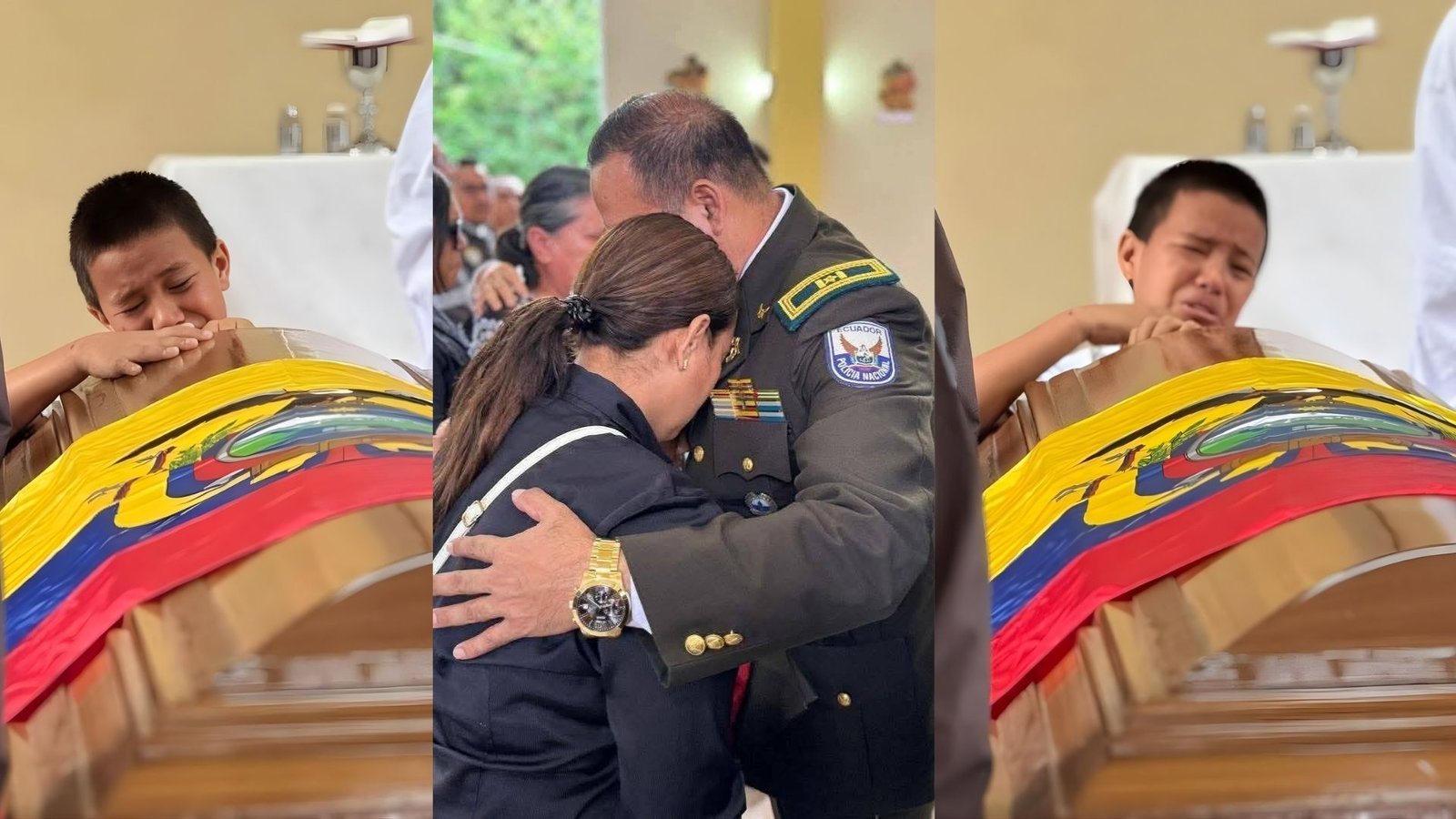 Desgarrador adiós en Manabí: Hijo se aferra al ataúd de su padre, el cabo Nelson Delgado, asesinado junto a sargento Edgar Suárez