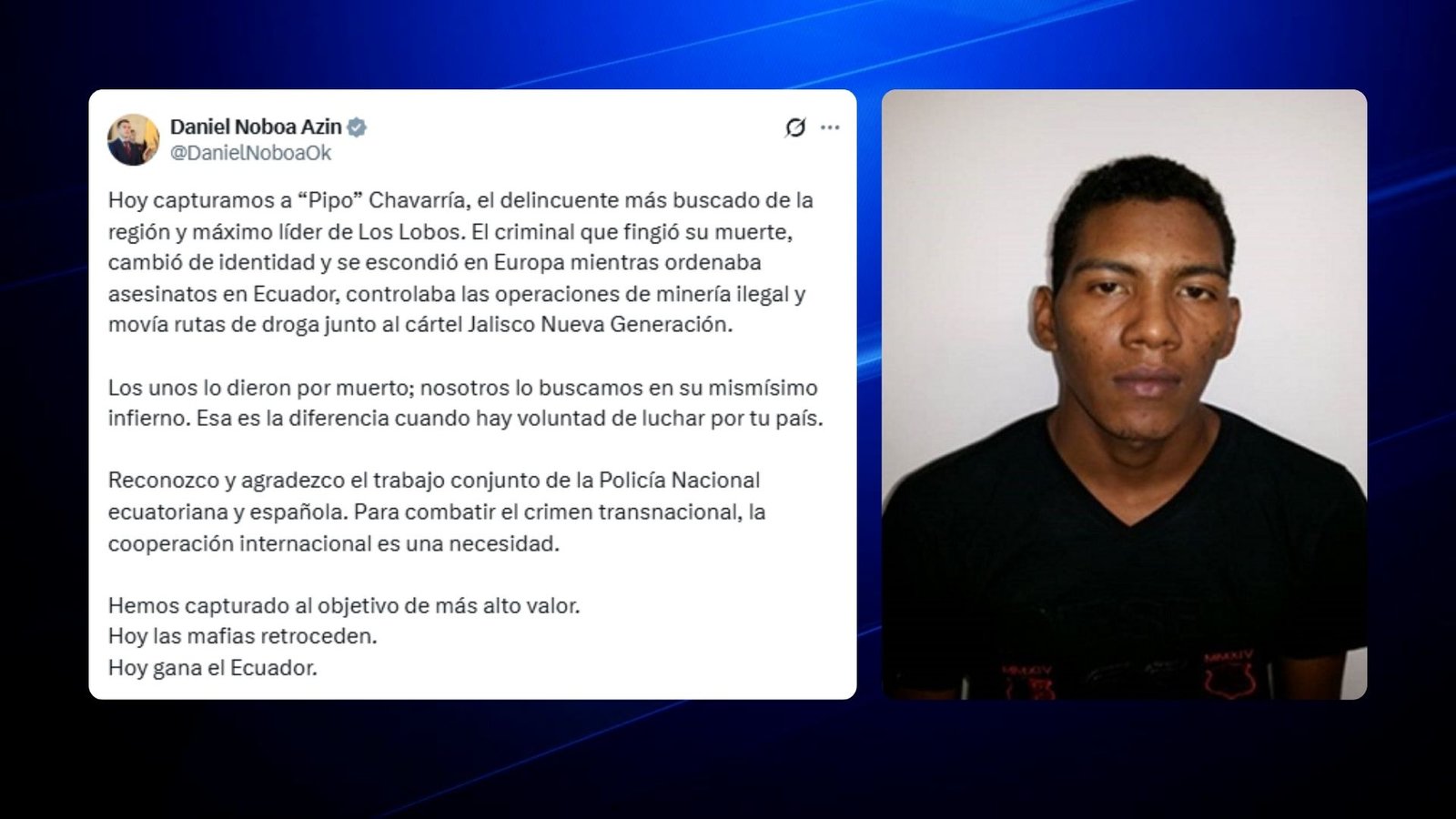 El presidente Daniel Noboa Azin confirmó este domingo 16 de noviembre de 2025, al inicio de la jornada electoral por la consulta popular y referéndum, la captura de Wilmer Geovanny Chavarría Barre, alias ‘Pipo’ o ‘Tuerto’, considerado el máximo cabecilla del grupo delictivo organizado (GDO) Los Lobos. El anuncio, realizado a través de su cuenta en X, se basa en un operativo de cooperación internacional entre las policías de Ecuador y España, que permitió localizar y detener al fugitivo en Europa, donde había cambiado de identidad y dirigía operaciones criminales desde 2021.