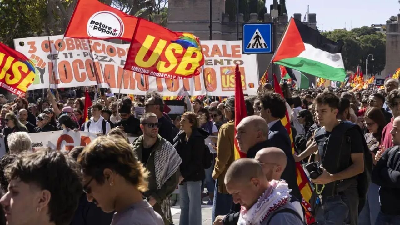 Este viernes 3 de octubre, Italia fue escenario de una jornada de huelga nacional y manifestaciones multitudinarias en solidaridad con la flotilla Global Sumud, detenida por Israel cuando intentaba llegar a Gaza. Las protestas también denunciaron la postura del gobierno de Giorgia Meloni frente al bloqueo israelí.