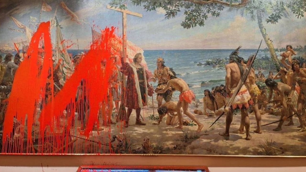Protesta en el Museo Naval de Madrid: activistas lanzan pintura sobre cuadro de Colón