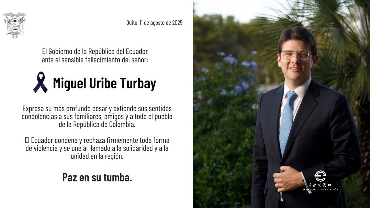 El Gobierno de la República del Ecuador ante el sensible fallecimiento del señor Miguel Uribe Turbay expresa su más profundo pesar y extiende sus sentidas condolencias a sus familiares, amigos y a todo el pueblo de la República de Colombia. pic.twitter.com/Wh8VNiKjuj— Cancillería del Ecuador 🇪🇨 (@CancilleriaEc) August 11, 2025