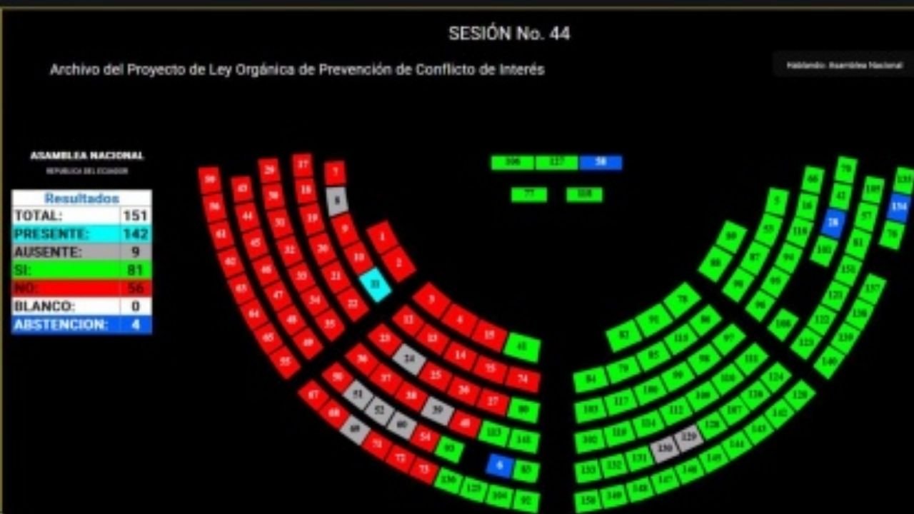 Con 81 votos afirmativos, el Pleno de la Asamblea Nacional resolvió archivar el proyecto de Ley de Prevención de Conflicto de Interés, al determinar que sus disposiciones podrían colisionar con la Constitución de la República, el Código Orgánico Integral Penal (COIP) y la Ley Orgánica de Servicio Público (LOSEP), afectando la coherencia del ordenamiento jurídico.