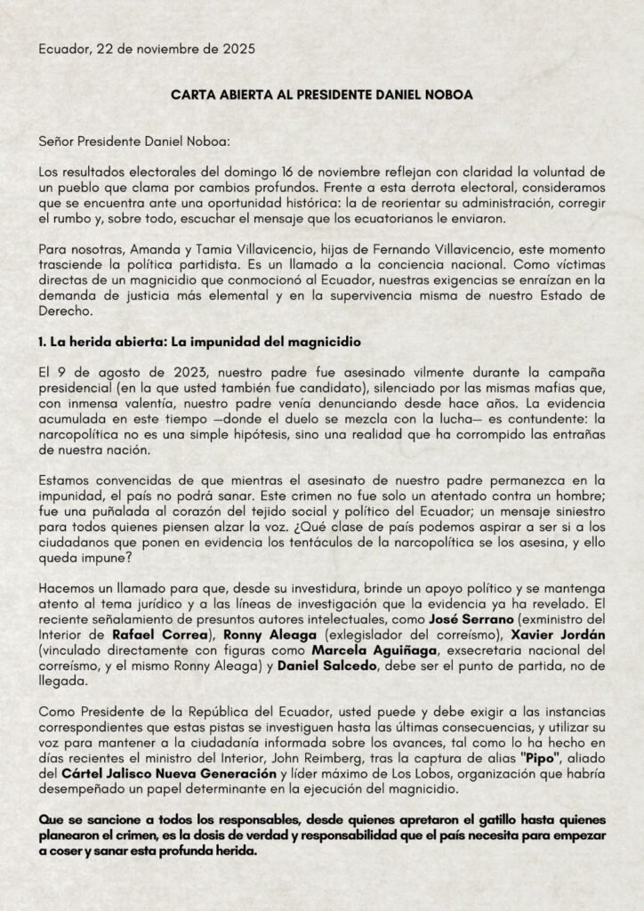 Amanda y Tamia Villavicencio, hijas del excandidato presidencial Fernando Villavicencio asesinado el 9 de agosto de 2023, dirigieron una carta abierta al presidente Daniel Noboa en la que exigen avances concretos en la investigación y sanción a los autores intelectuales del magnicidio.